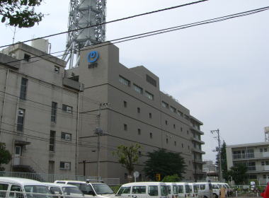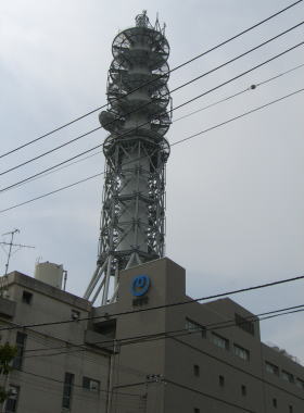| 藤沢グランドホテル前の交差点から見た局舎ビル。アンテナからすぐに場所が分かります。 | 下から見たアンテナ |