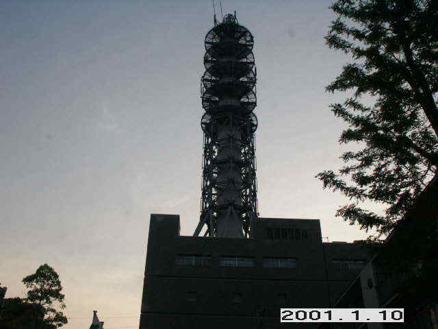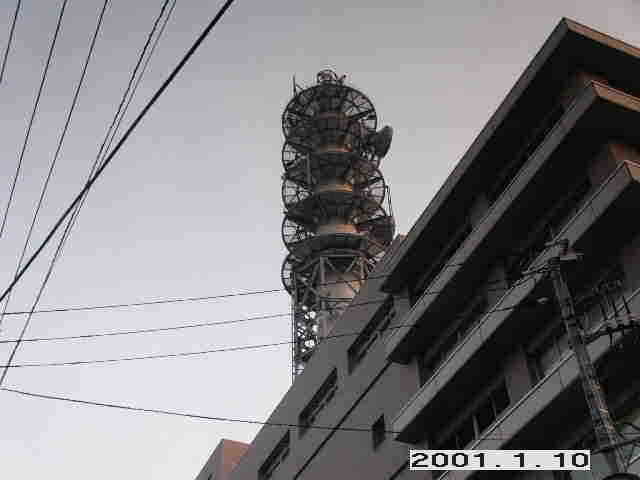 | アンテナ部分。実際稼動しているアンテナは少ないのだろう。光ファイバの発展により、短中距離の無線中継は縮小傾向か? | 下から見たアンテナ、取り直し。 |