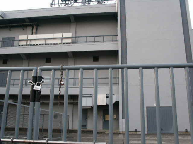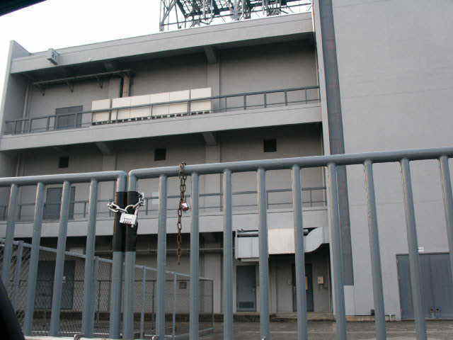 建物の入り口は、しっかりと施錠されている。3フロアを使っているので、そこそこの規模の交換局。前方の柵が、焼肉屋駐車場のもの。